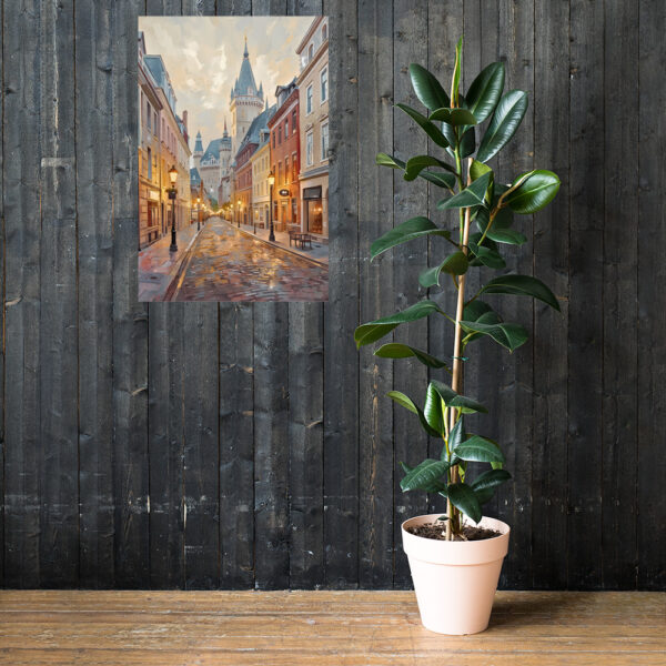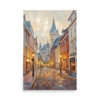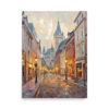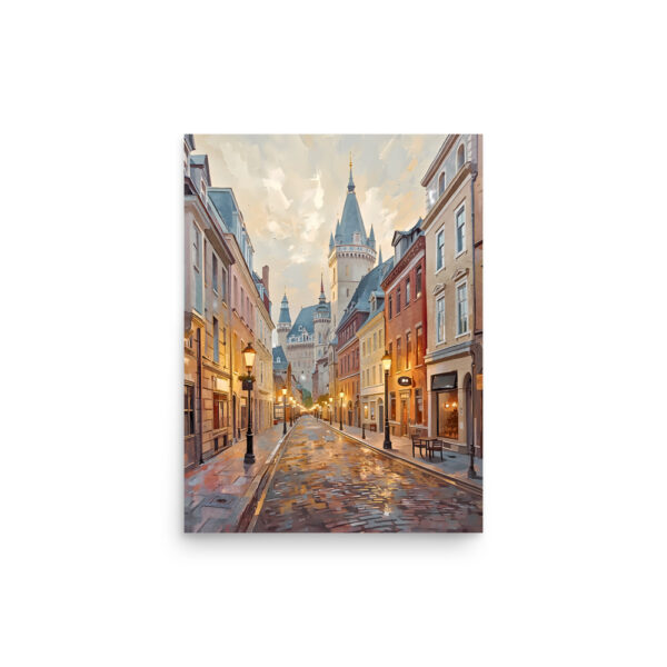 Rendered in a painterly impressionist style, the scene builds gradually. Light flickers, gathers, and settles into a steady glow. The street leads forward, but never rushes.