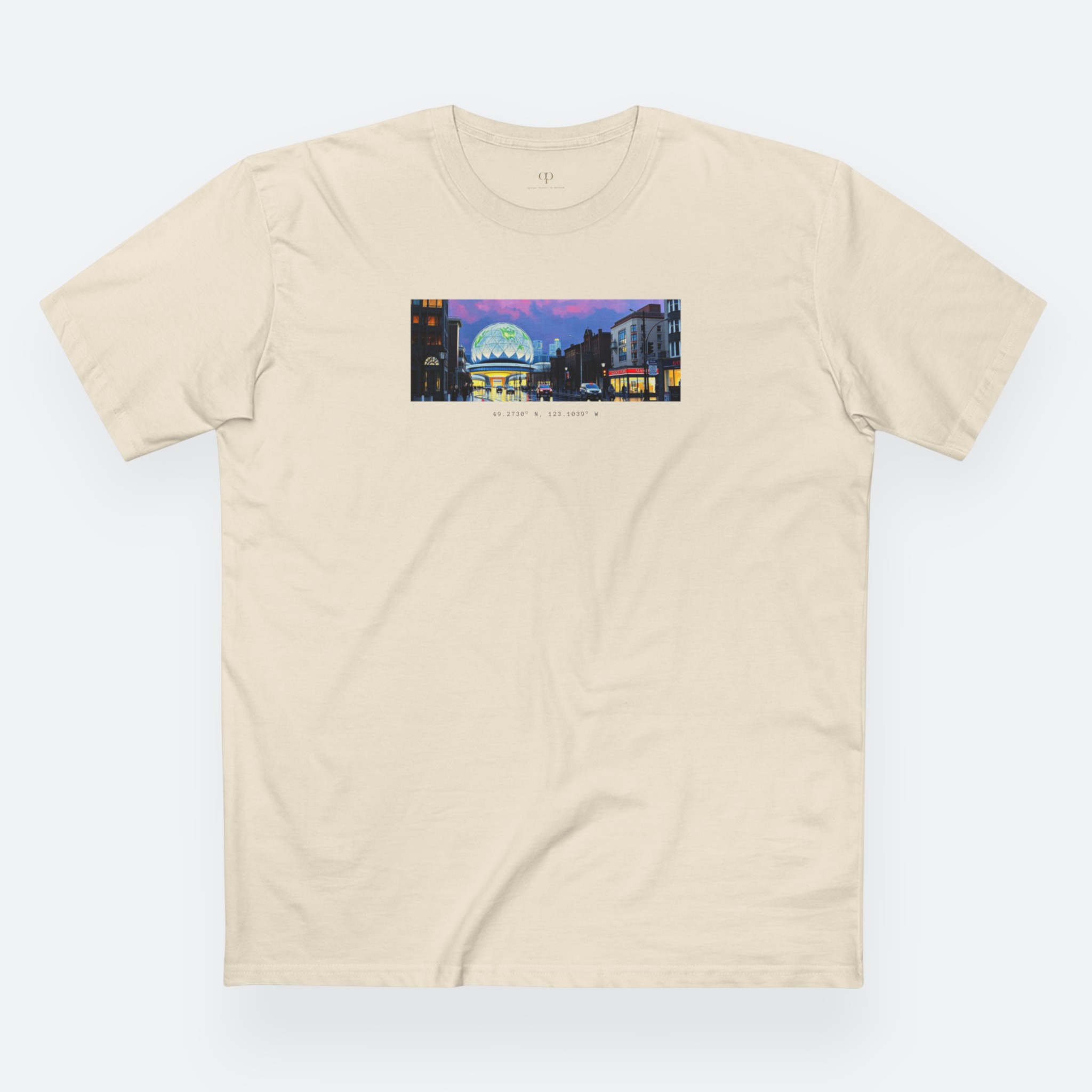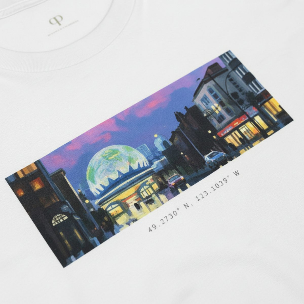 A night-lit glass dome and street glow, marked with Vancouver’s coordinates. It feels like being inside a city moment that only you noticed.