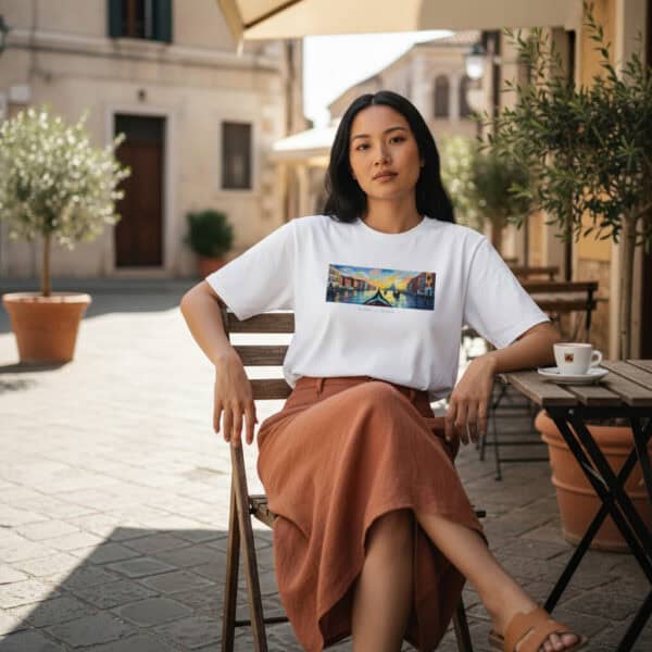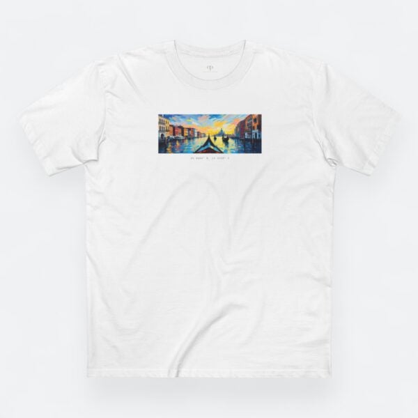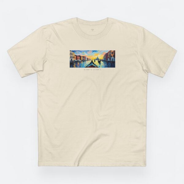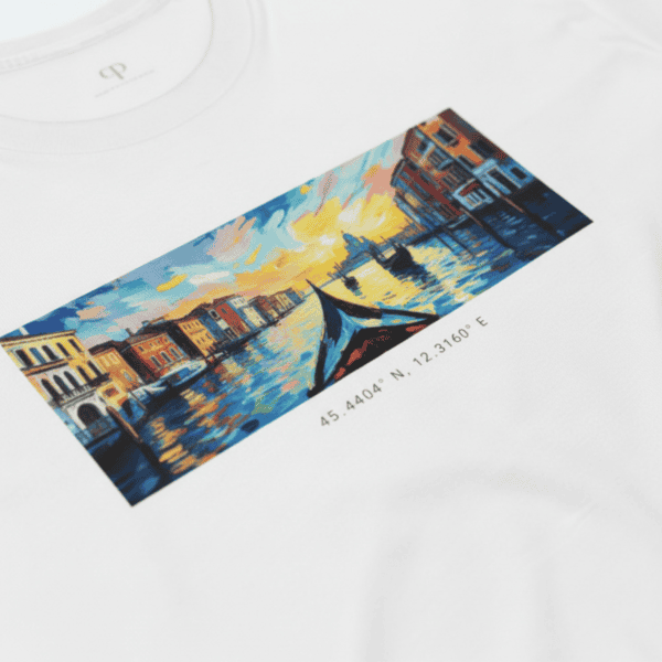 A glowing canal-at-sunset scene with Venice coordinates printed beneath. Wear it like you’re carrying a memory instead of a logo.